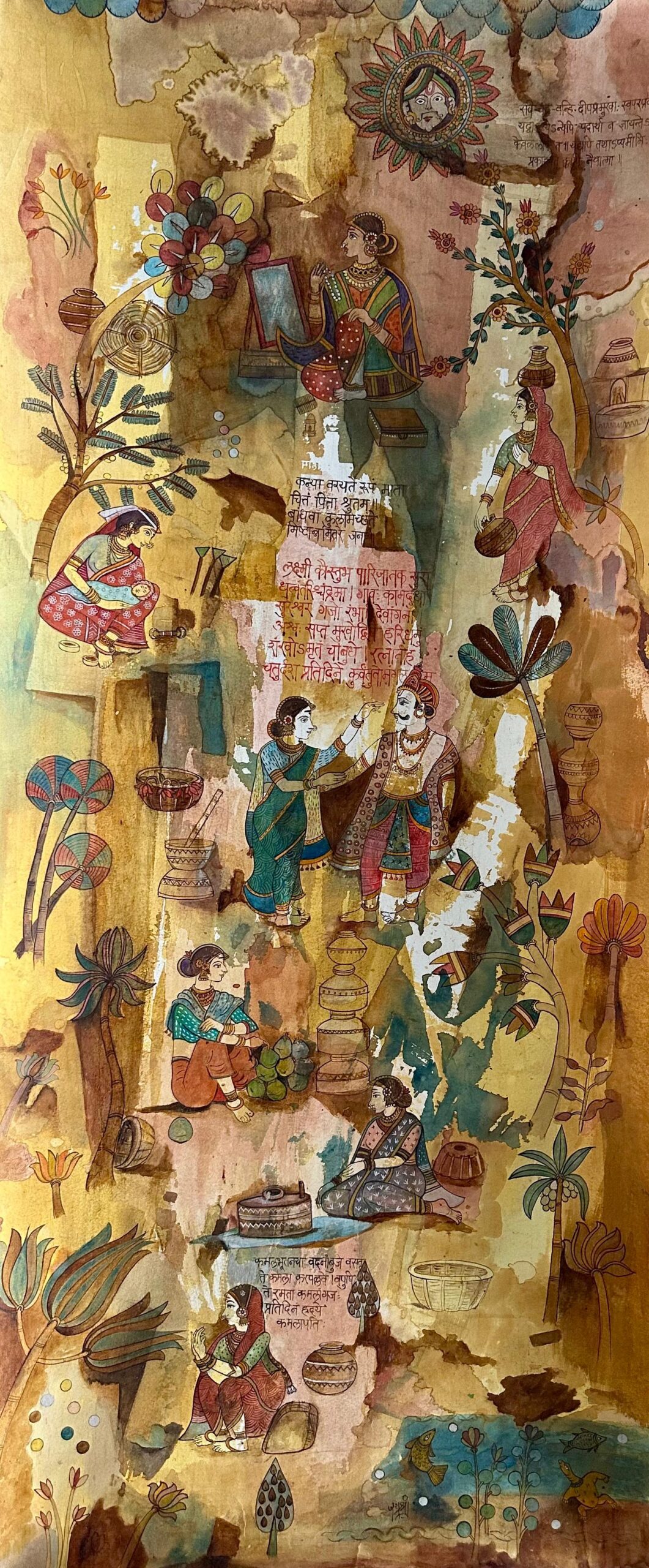 Jayashree Patankar is an artist who has deliberately opted to adopt a style of painting that is almost extinct. She has amalgamated the traditional style of paintings known as ‘Chitra Kathi’. This form of painting was largely practised in Maharashtra and literally translated it means narrating a story by means of pictures. Though typically these paintings were used as story boards to illustrate or highlight a point of the story, usually the epics of Ramayana or Mahabharata, Patankar is not fettered by the traditional storylines, she freely incorporates the contemporary life around her.