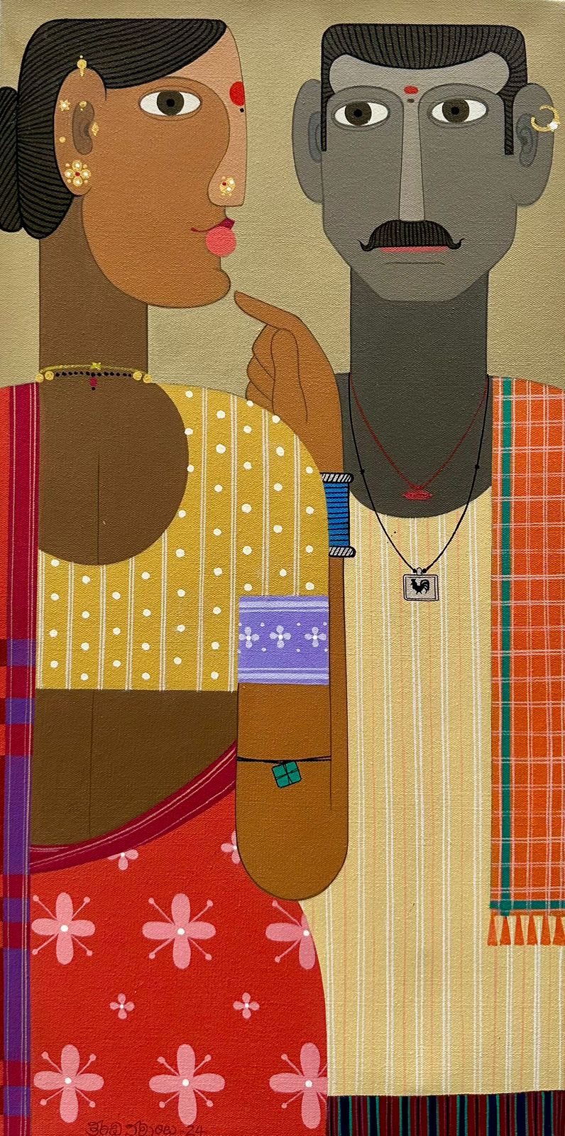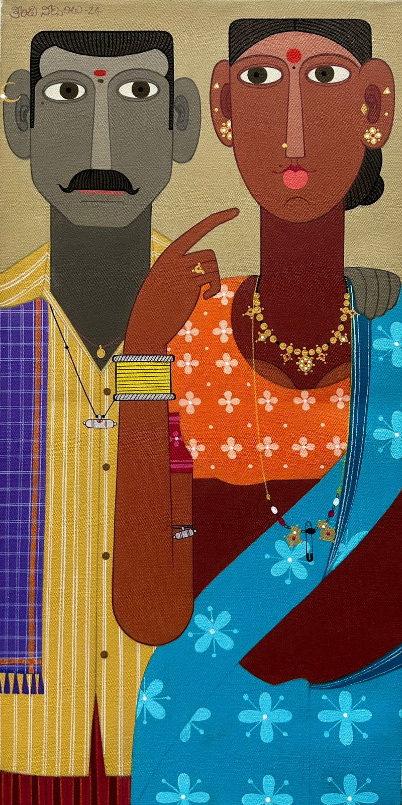 “Rural Whispers” is a collection of figurative art splendour. It is a riot of warm and cool colours used together to create a vibrancy that relates to the villages of India. The fluorescence of the colours leaves a deep impression on our minds and play all the right heart strings. The women clad in effervescent sarees with subtle prints and men in traditional, organic colours project an unrivaled sense of authenticity. It depicts an ethereal, rural, Telangana, where women hang keys to their mangalsutra and men wear silver amulets. They sport vermillion bindis that reflect deep-rooted Indian culture. They emulate scenes of confabulation where the locales converse with their eyes and share glorious stories. Their whispers emanate from the paintings as we look into their mysterious eyes.