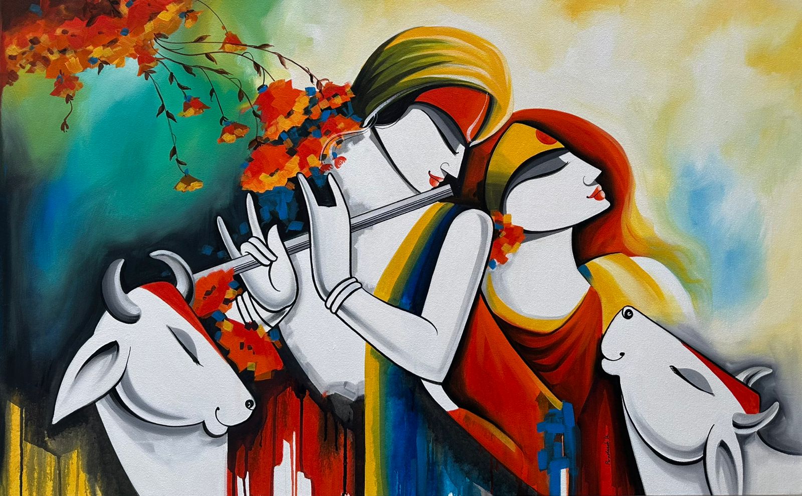 Praddesh is a self taught artist with a Diploma in Photography. Born in Kerala, India. Faces, intricate patterns, flowers and light and shade are all brought together in Pradeesh K’s works. The faces are portrayed in bold colours, melded with hues from the background. The colours are soft, but still seem to glow from the canvas, the masterful shading providing a contrast between the subject and the backdrop. Patterns are prevalent everywhere, the petals of the blooms are carefully etched onto the subject itself.