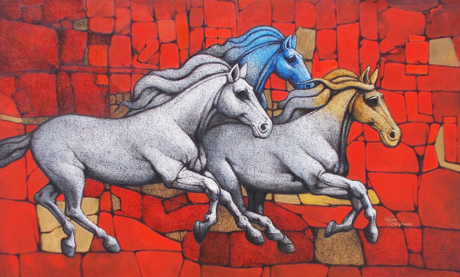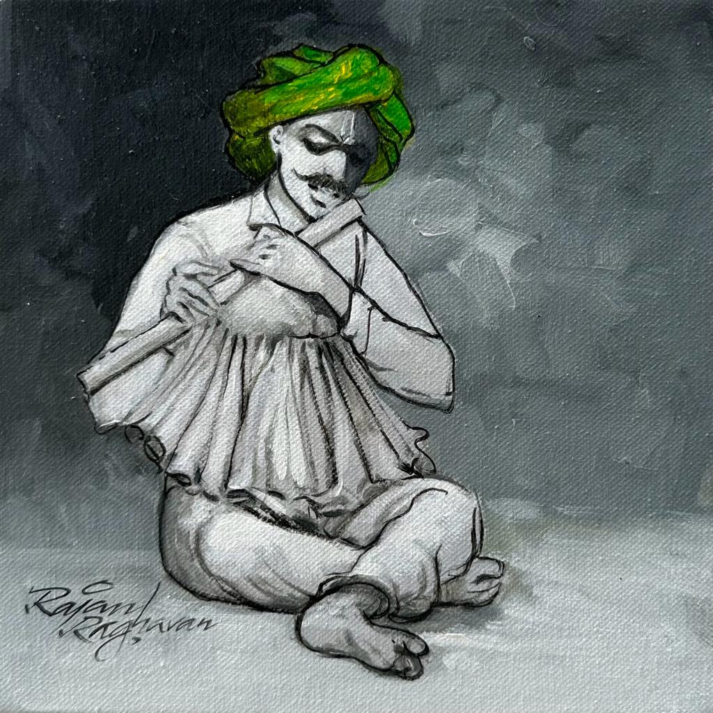 Rajan paints in two styles – Abstract and Rajasthani themes. Though both are completely different, he has mastered the skill of both styles. Showing contemporary abstracts using a bright palette is what he loves. Along with that his traditional side of painting involves Indian culture, music, clothing all infused into one.