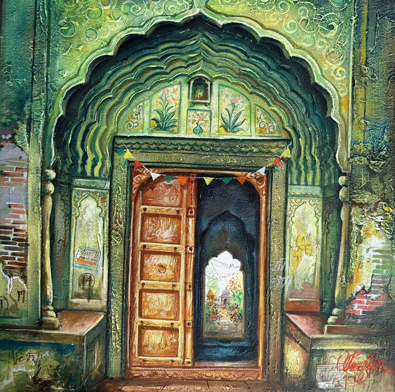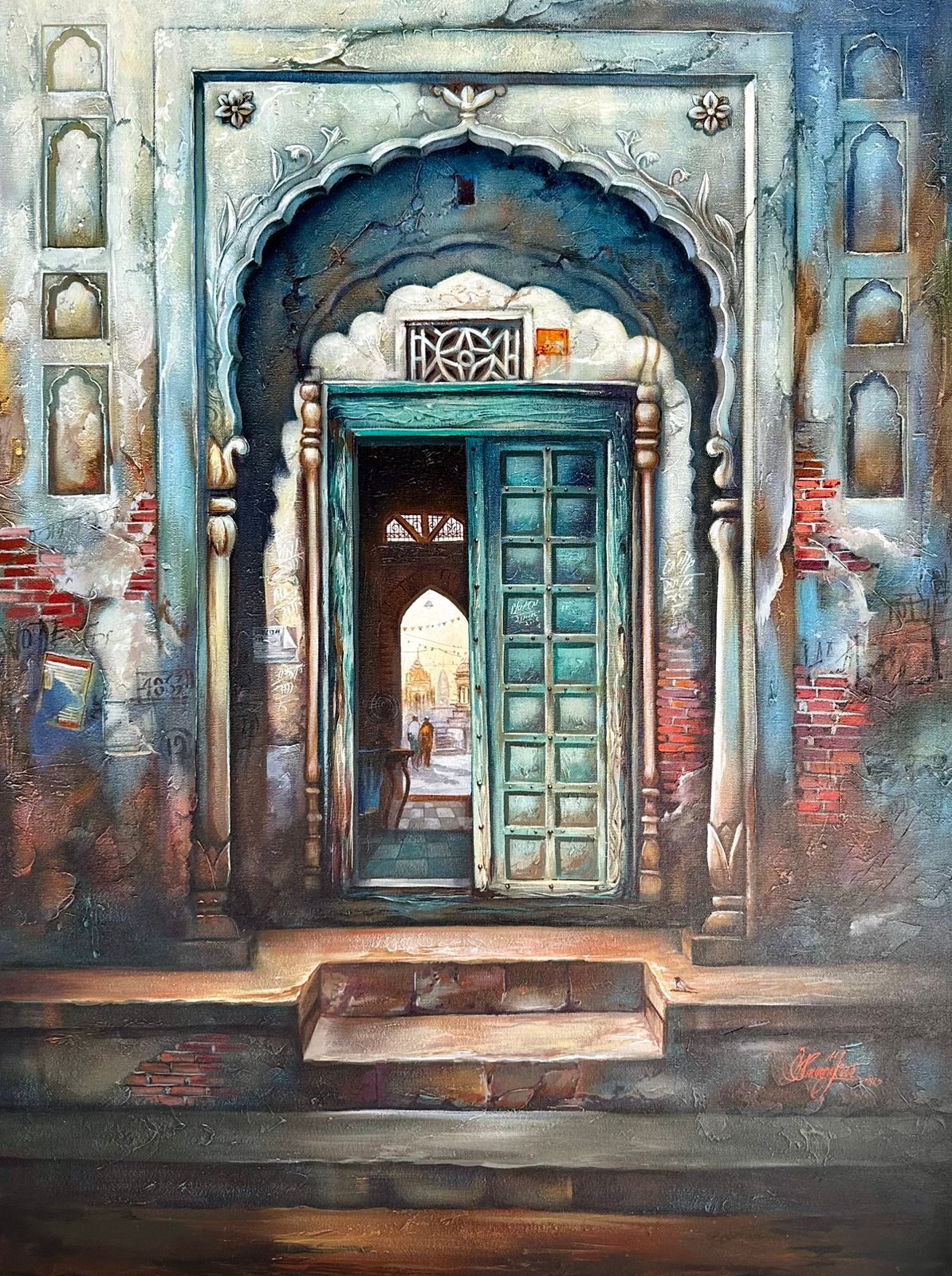 Ram Onkar is also known for his Indian door series wherein he brings life to the traditional entry ways and doorways of India. Depicting life beyond the door while keeping the mystery, Ram Onkar paints highly detailed and raw door paintings.
