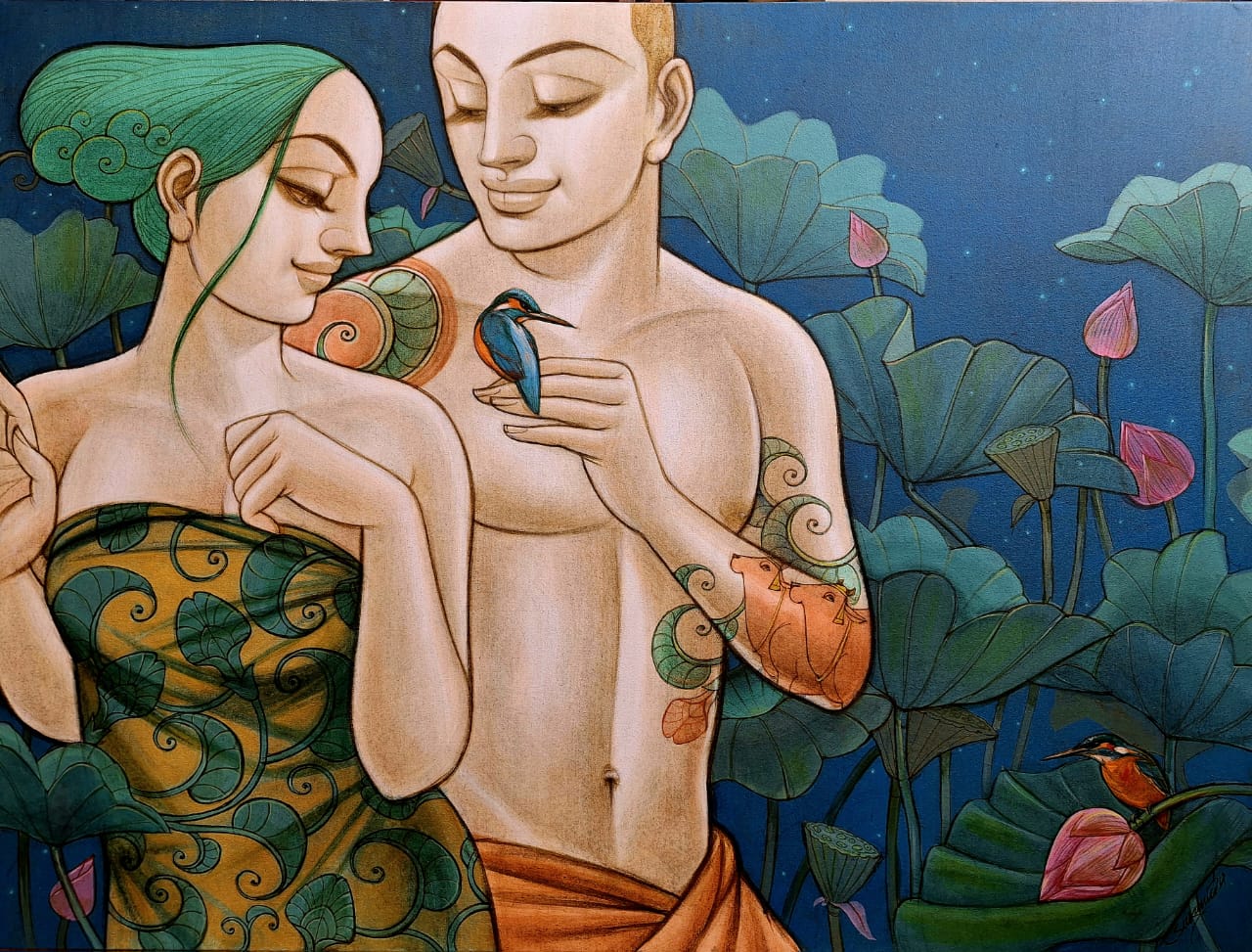 Artist Sukanta Das was born in 1973 in Kolkata, and graduated with Bachelor’s degree in Visual Arts from the Rabindra Bharti University, Kolkata, in 1996. Sukanta Das’ works have a surreal and dreamlike quality and often portray the grace and beauty of the feminine form. The miniatures, usually portraying the stories of Krishna, speak of emotions and desires held deep within his characters. He often portrays his figures as a unique blend of nature, mythology and human relationships.