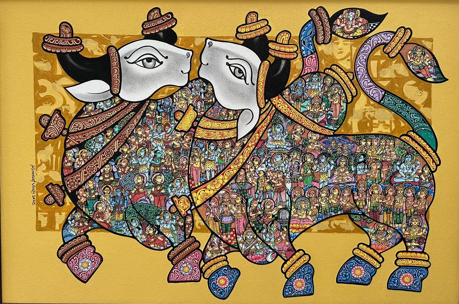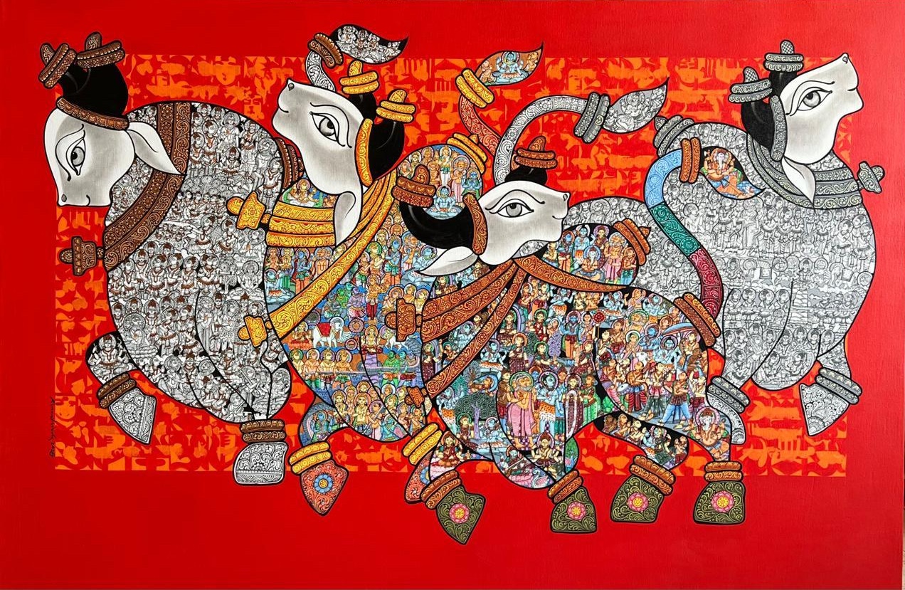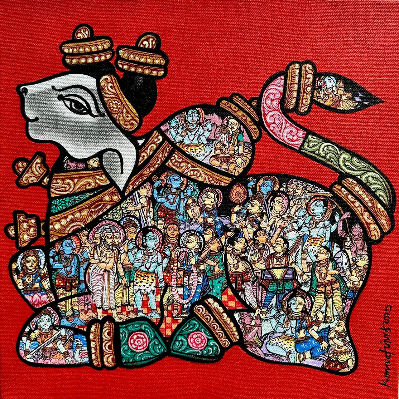 The artist works on the theme of the majestic Indian bull. The form of the bull indicates power, a strength to do a great capacity of work. The artist believes that the magnetic structure of a bull attracts positive auras. It also plays a strong role in our Indian mythology with Lord Shiva, known as Nandi. The form of the bull keeps the mind and body active and strong.