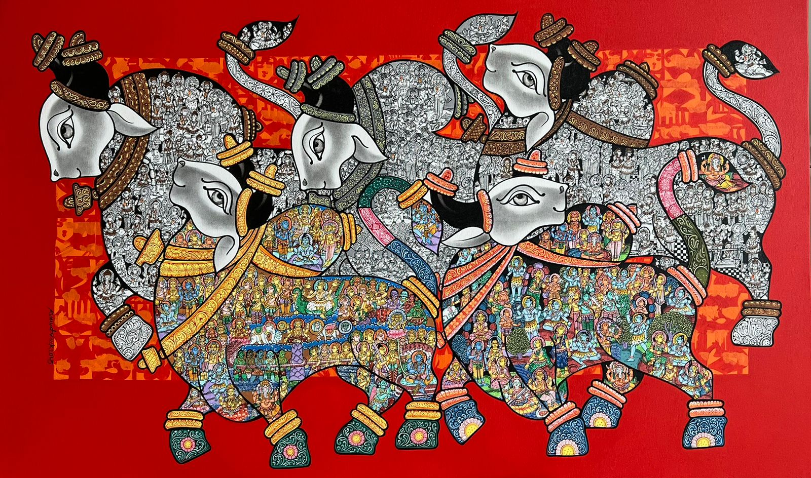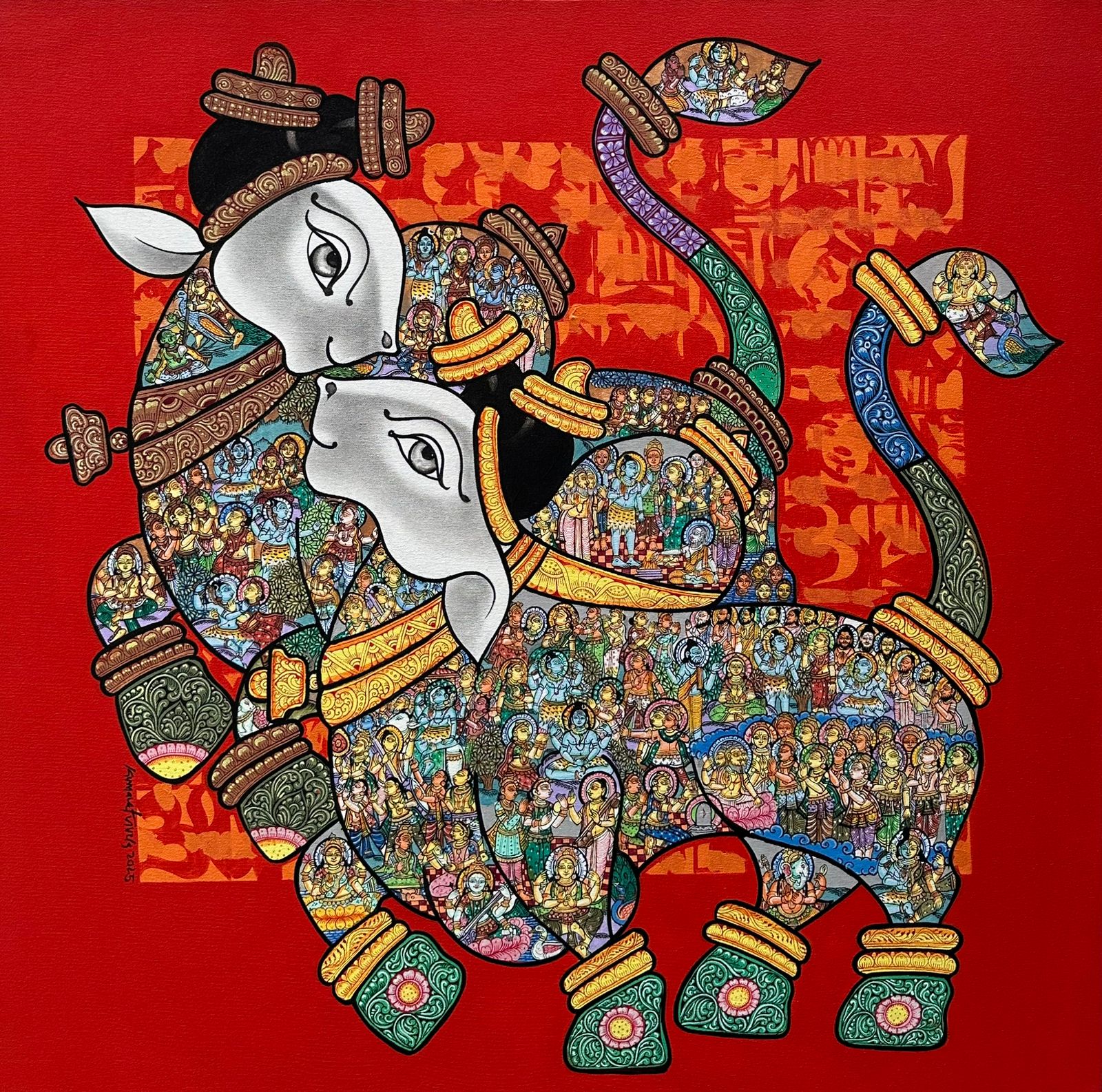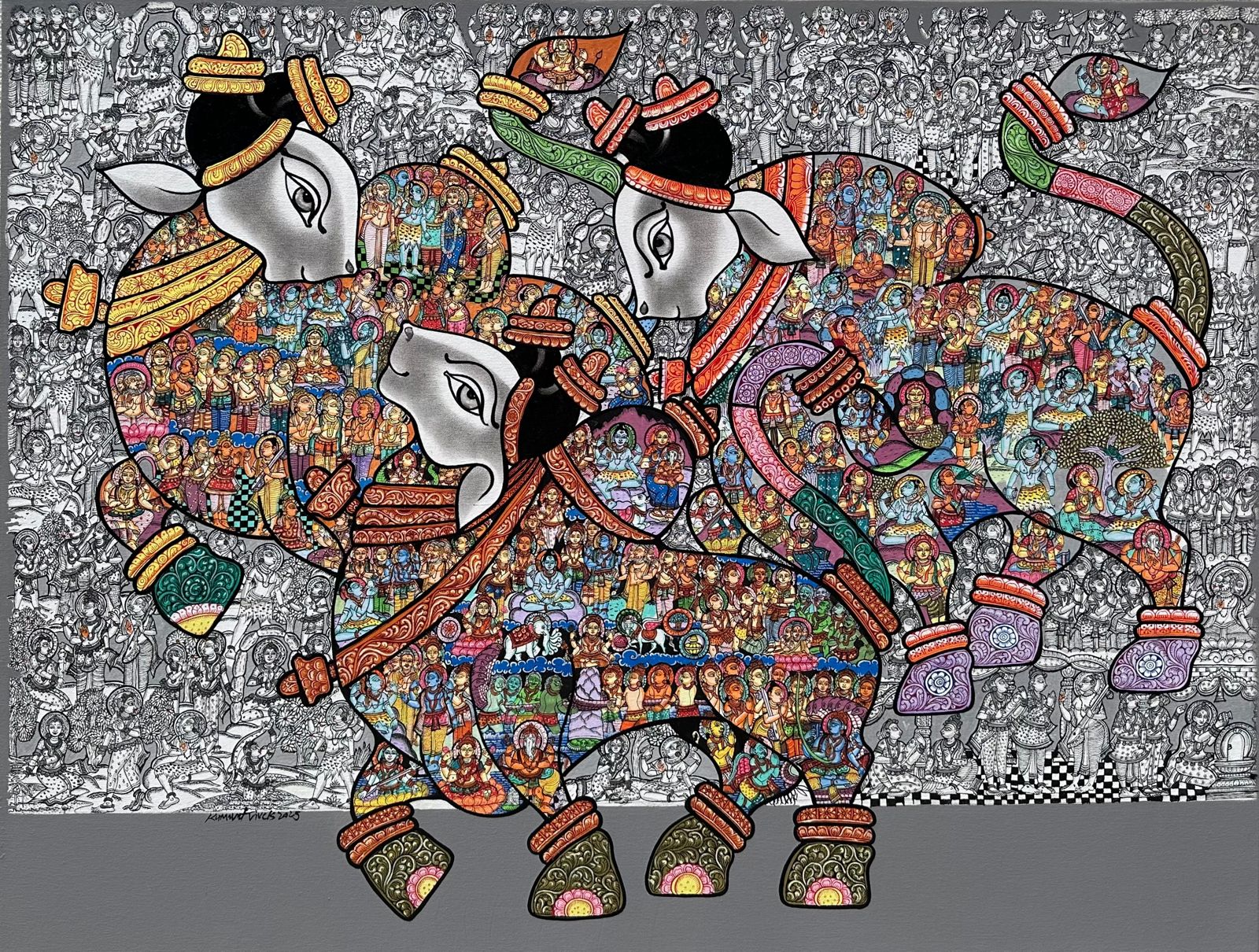 The artist works on the theme of the majestic Indian bull. The form of the bull indicates power, a strength to do a great capacity of work. The artist believes that the magnetic structure of a bull attracts positive auras. It also plays a strong role in our Indian mythology with Lord Shiva, known as Nandi. The form of the bull keeps the mind and body active and strong.